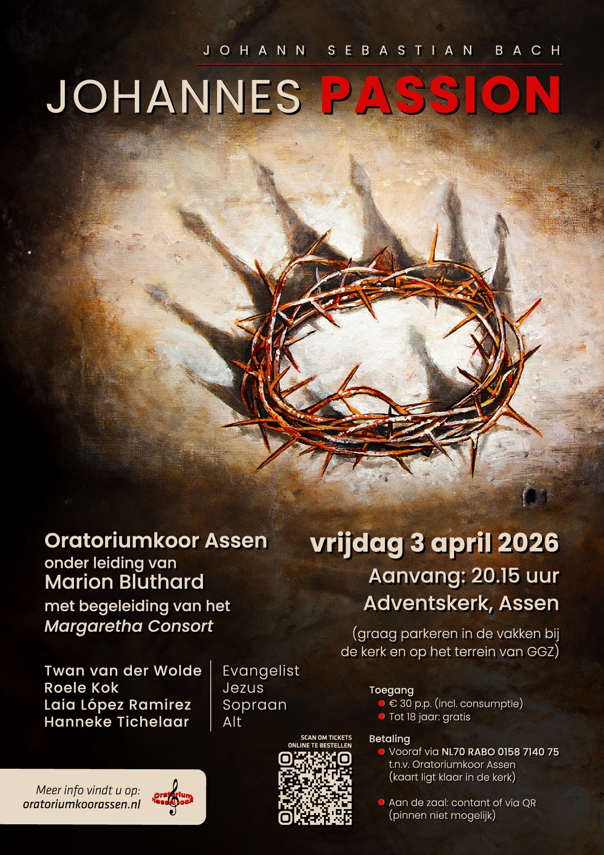 Het Oratoriumkoor brengt op 3 april de Johannes Passion ten gehore in de Adventskerk in Assen. Aanvang is 20.15 uur. De Johannes Passie is compacter dan de MatthÓ“us Passie, de aria’s zijn over het algemeen beknopter, het verhaal ontwikkelt zich sneller, feller en de spanningsboog is strakker. Dat geeft het werk een intense, bijna ademloze dramatiek. Toch draait het uiteindelijk niet alleen om het lijden zelf, maar om wat daarachter schuilgaat. In deze muziek klinkt, juist in de donkerte, het vooruitzicht van overwinning op de dood. Wanneer wij dit verhaal plaatsen in de wereld van vandaag, met haar conflicten en onrust, dringt een vraag zich op: is er eigenlijk zoveel veranderd? Juist daarom is het zingen en beluisteren van de Johannes Passie meer dan herdenken alleen. Het is ook een moment om hoop te koesteren, een uitnodiging om te blijven vertrouwen op een betere wereld. Muziek speelt daarin een onmisbare rol.
